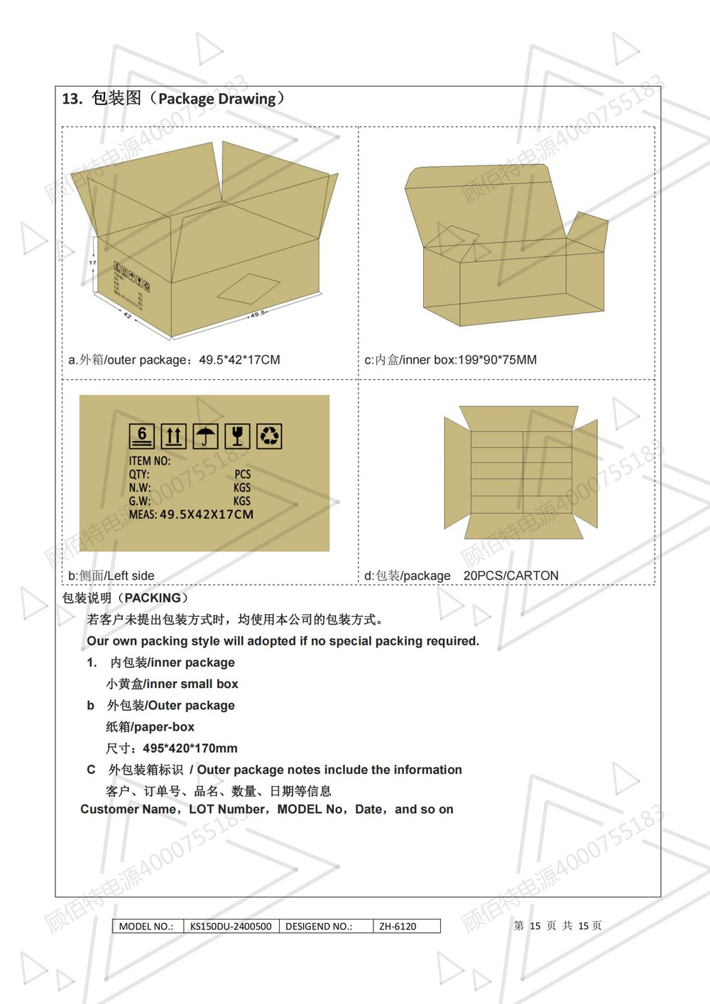 24V5A電源適配器規(guī)格書資料詳細(xì)描述了一款120W(連續(xù)輸出功率)開關(guān)電源的電氣性,結(jié)構(gòu)性及環(huán)境等要求。